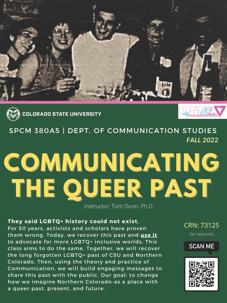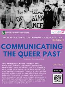 NOW CLOSED. If you are a student at Colorado State University, one of the best ways to get involved in the work of the Queer Memory Project of Northern Colorado is to take our undergraduate classes on campus in Spring 2022.