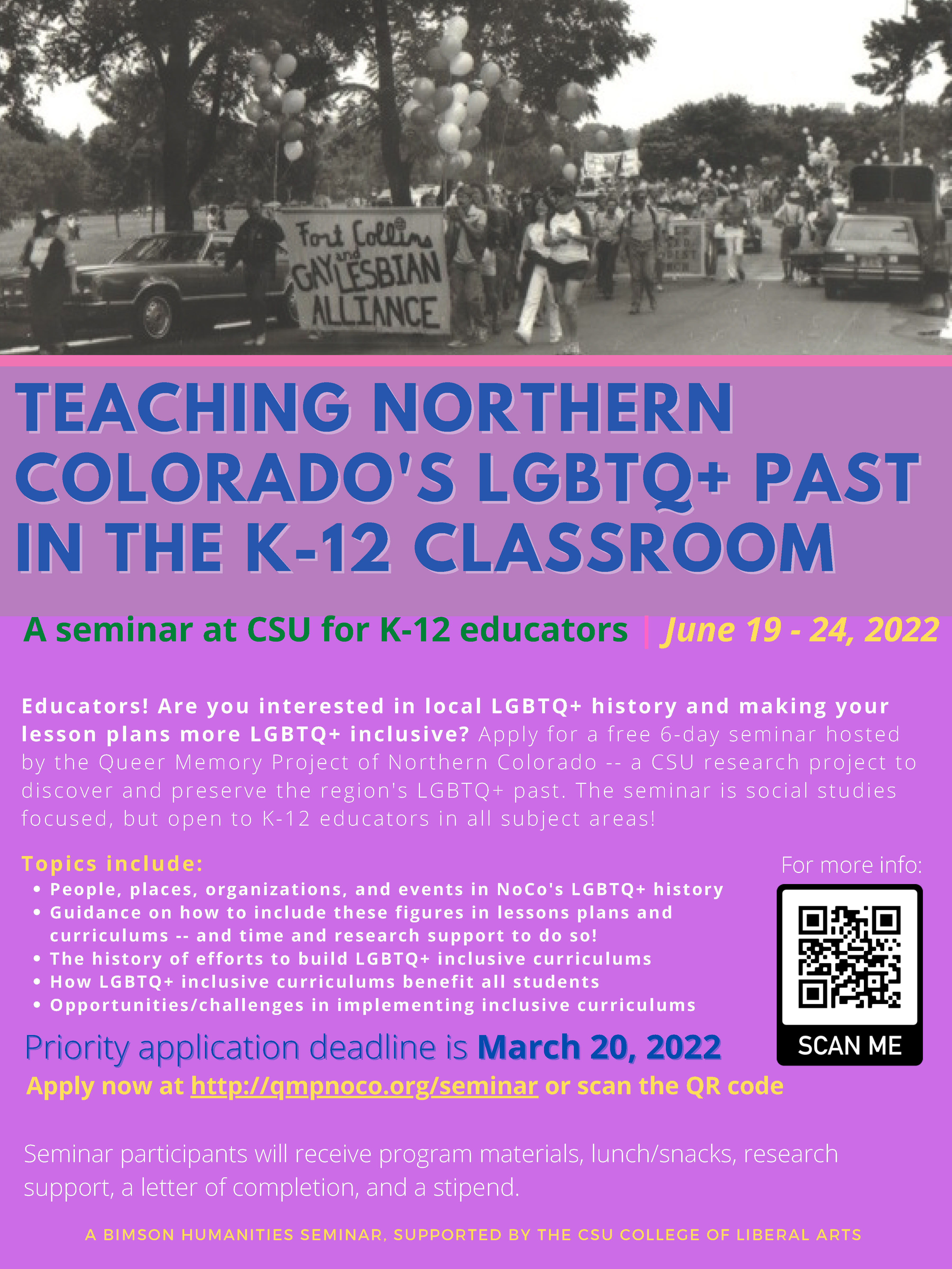 NOW CLOSED. K-12 educators can apply for our 2022 Summer Seminar: “Teaching Northern Colorado’s LGBTQ+ Past in Colorado K-12 Classroom.” This seminar is sponsored by the Carl A. Bimson Humanities Seminar program at Colorado State University’s College of Liberal Arts. The priority deadline to apply is March 20, 2022; however, we are accepting applications on a rolling basis until the seminar is full. To apply or find out more, visit our seminar page.