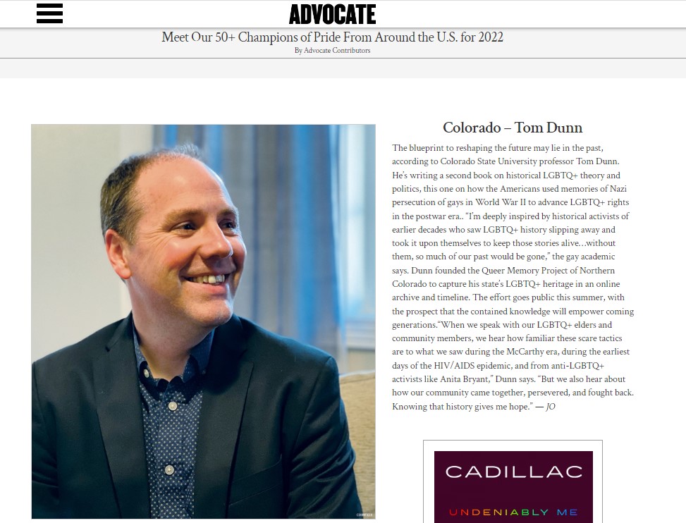 Tom Dunn, founder and Director of the Queer Memory Project of Northern Colorado, was named the Colorado representative for The Advocate magazine’s Champions of Pride 2022. Dunn and the profiles of other awardees was featured in the June issue of the magazine. You can read Dunn’s profile here.